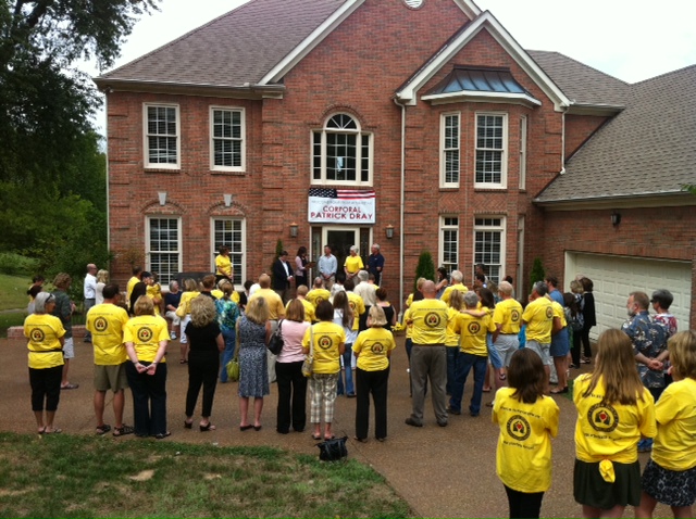 Friends, family and neighbors joined together to welcome Cpl. Patrick Dray home from his most recent deployment with a large party. As a tribute to his service, t-shirts were sold to raise money for the Tennessee Fisher House Foundation, Inc. to build a ‘home away from home’ on the Alvin C. York VA Campus. This 20-bedroom/bath home will offer free lodging to active military and veteran families so that they can be near their loved one while they are receiving care at the York VA as well as the Nashville VA Hospital. The t-shirts were ordered through www.bigfrog.com/nashville/militaryhomecoming.