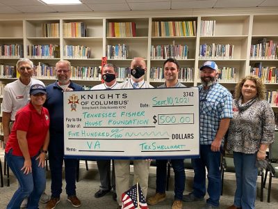 Knights of Columbus Chapter # 4563 of St. Rose of Lima Roman Catholic Church in Murfreesboro, TN donated to The Tennessee Fisher House Foundation on September 10, 2021. Knights of Columbus members Tex Shellhart, and John McNicholas (center) made the presentation to Foundation Board members Lou Ferraro, Stephanie Sturdivant, President Tom Allard, Cliff Hardy, Joe Baltz, and Dana Kizer-Shands.