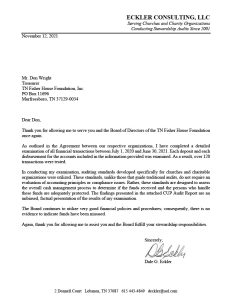 We are very proud of our reputation for being excellent stewards of the money we receive from our donors. Please know that is our upmost responsibility. Thank you for your continued donations so we can provide for our Military Veterans and their families. TN Fisher House – 2021 – Audit Letter