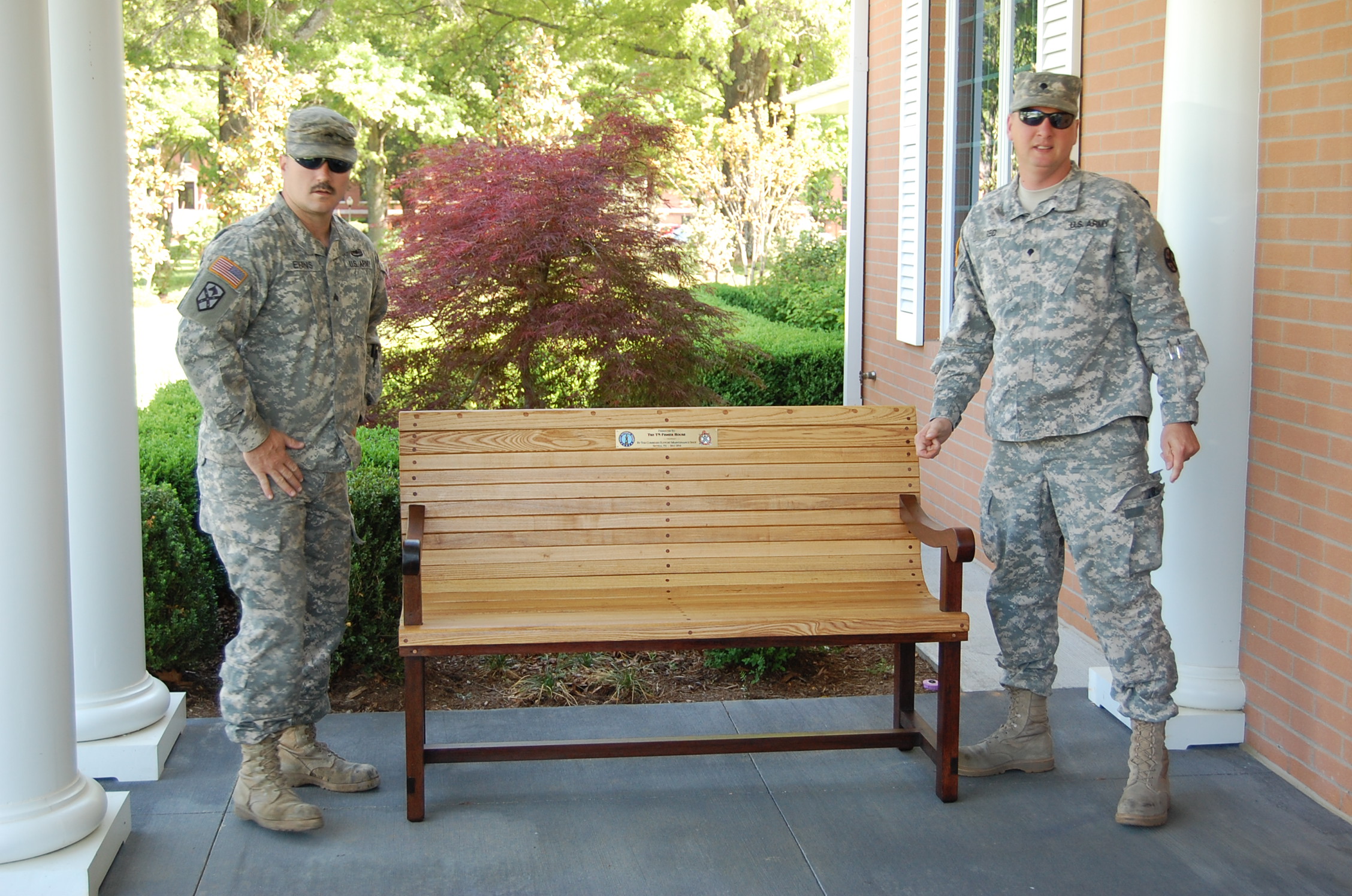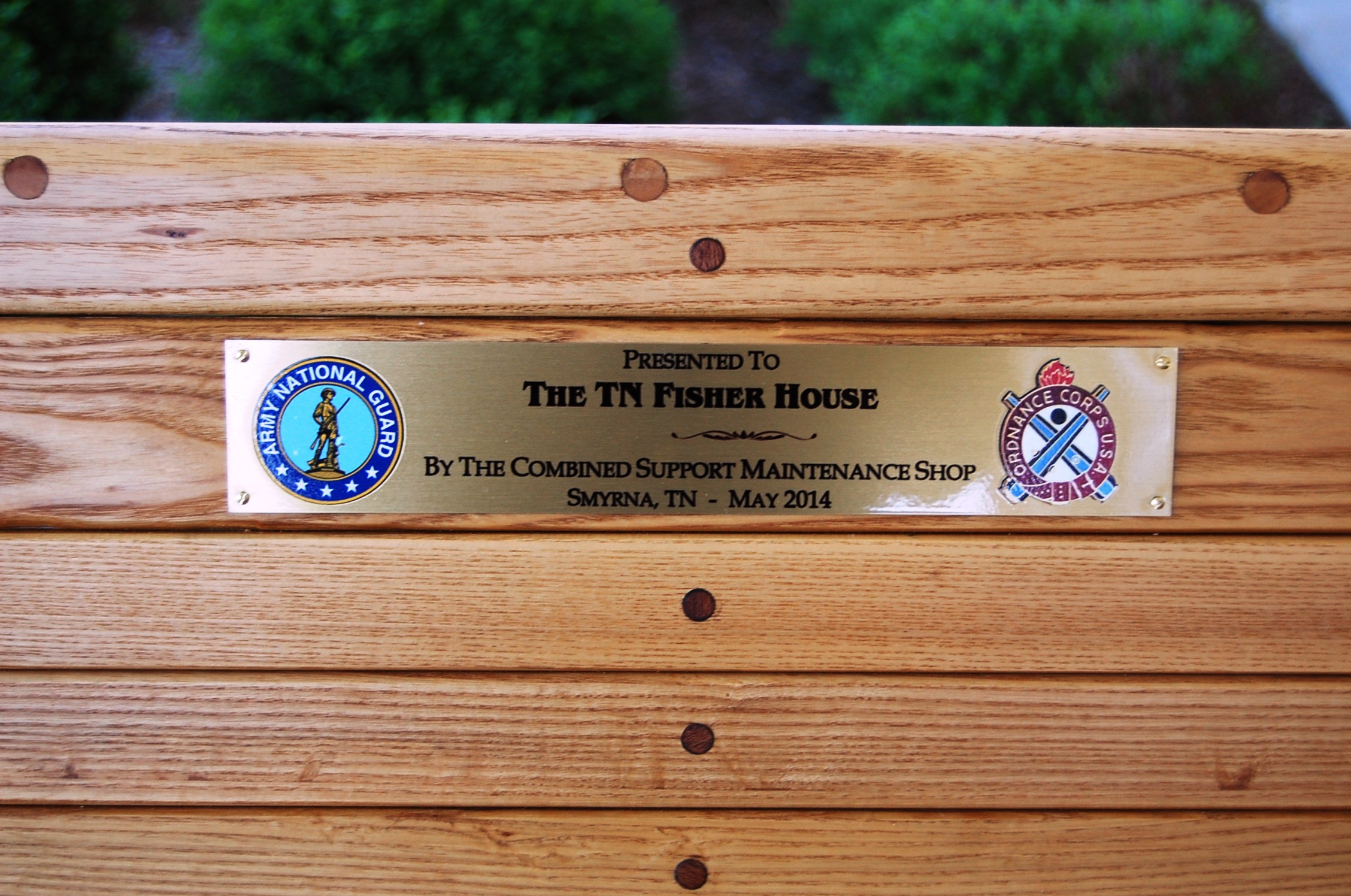 We wish to deeply thank the members of the TN Army National Guard Support Maintenance Group for making the beautiful benches for the Tennessee Fisher House. They are made from recycled oak and mahogany.